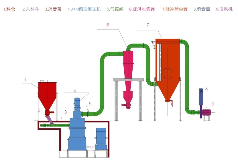 JXM環(huán)輥微粉磨(中速微粉磨)全套設(shè)備包括:錘式破碎機(jī)、斗式提升機(jī)、儲(chǔ)料倉(cāng)、電磁振動(dòng)給料機(jī)、主機(jī)、選粉機(jī)、擴(kuò)散式雙旋風(fēng)集粉器、脈沖式除塵器、高壓風(fēng)機(jī)、消聲器。主機(jī)電動(dòng)機(jī)通過(guò)減速機(jī)帶動(dòng)主軸及各層轉(zhuǎn)盤旋轉(zhuǎn),轉(zhuǎn)盤通過(guò)柱銷帶動(dòng)幾十個(gè)環(huán)輥在磨環(huán)滾道內(nèi)滾動(dòng)并旋轉(zhuǎn)。大塊物料經(jīng)破碎機(jī)破碎成小顆粒后由提升機(jī)送入儲(chǔ)料倉(cāng),電磁振動(dòng)給料機(jī)將物料均勻的送到上轉(zhuǎn)盤的中部,物料在離心力的作用下散向圓周邊,并落入磨環(huán)的滾道內(nèi)被環(huán)輥沖壓、滾碾、研磨而粉碎,物料經(jīng)第 一層粉碎后又落入第二層及第三層,高壓離心風(fēng)機(jī)的抽吸作用將外部空氣吸入機(jī)內(nèi),并將經(jīng)過(guò)第三層粉碎后的粗粉帶入選粉機(jī)內(nèi)。選粉機(jī)內(nèi)旋轉(zhuǎn)的渦輪所產(chǎn)生的渦流使粗顆粒物料回落重磨,細(xì)粉則隨氣流進(jìn)入旋風(fēng)集粉器并由其下部的卸料閥排出即為成品,而帶有少量細(xì)粉塵的氣流則經(jīng)過(guò)脈沖除塵器凈化后通過(guò)風(fēng)機(jī)及消聲器排出。